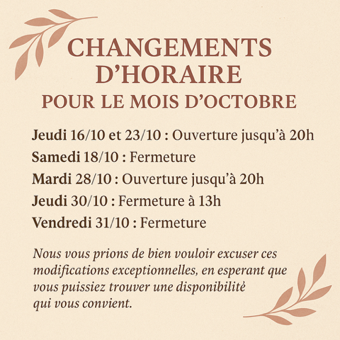 Le jeudi 16/10 ainsi que le jeudi 23/10, le cabinet sera ouvert jusqu'à 20h.
